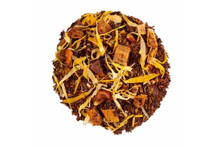 El Rooibos Manzana-Caramelo es una infusión aromatizada que combina la base suave y naturalmente dulce del Rooibos Super Grade con el sabor frutal de manzana (16 %) y un toque de caramelo (7 %), acompañado de pétalos de caléndula para una experiencia aromática deliciosa.
