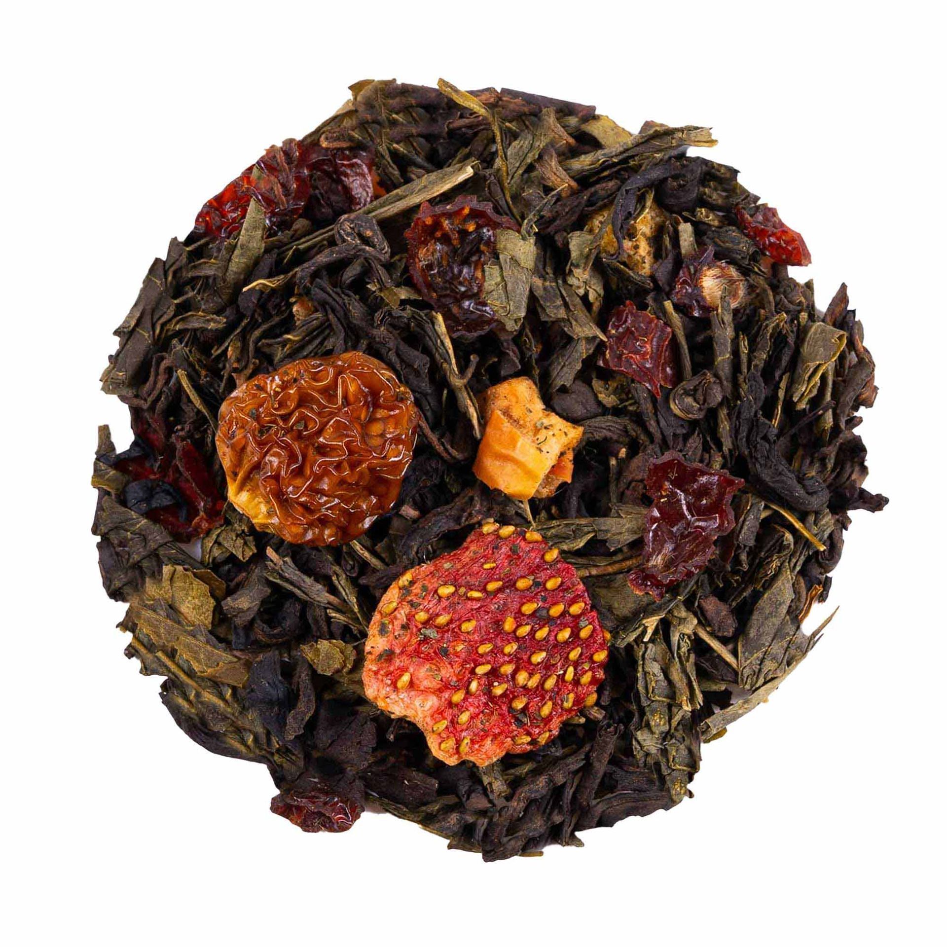 El Té Pu Erh Brisa de verano es una mezcla aromatizada que combina la profundidad terrosa del té Pu Erh con la frescura y dulzura natural de frutas seleccionadas como fresa, kiwi y manzana, complementadas con té verde China Sencha, té verde China Jazmín y escaramujo. Esta fusión ofrece una infusión equilibrada y vibrante, ideal para los amantes del té que buscan un blend frutal, aromático y refrescante.